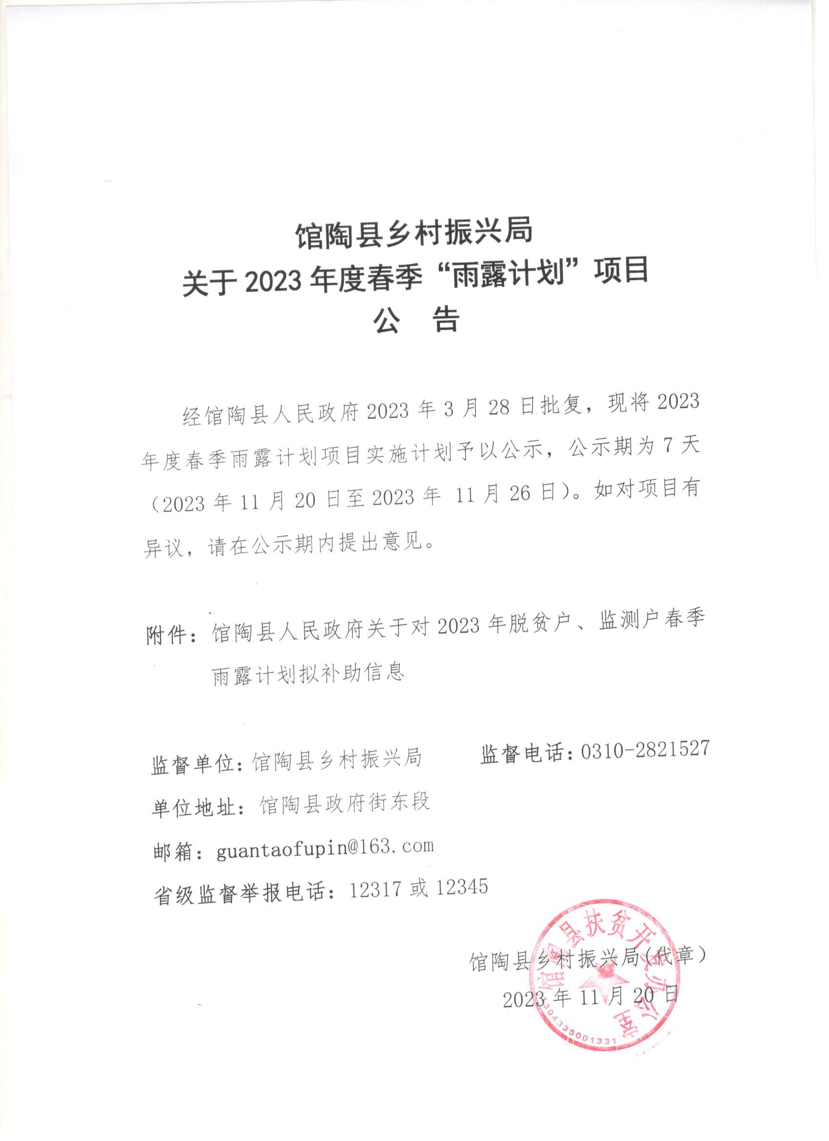 经馆陶县人民政府2023年3月28日批复,现将2023年度春季雨露计划项目实施计划予以公示,公示期为7天(2023年11月20日至2023年 11月26日)。如对项目有异议,请在公示期内提出意见。