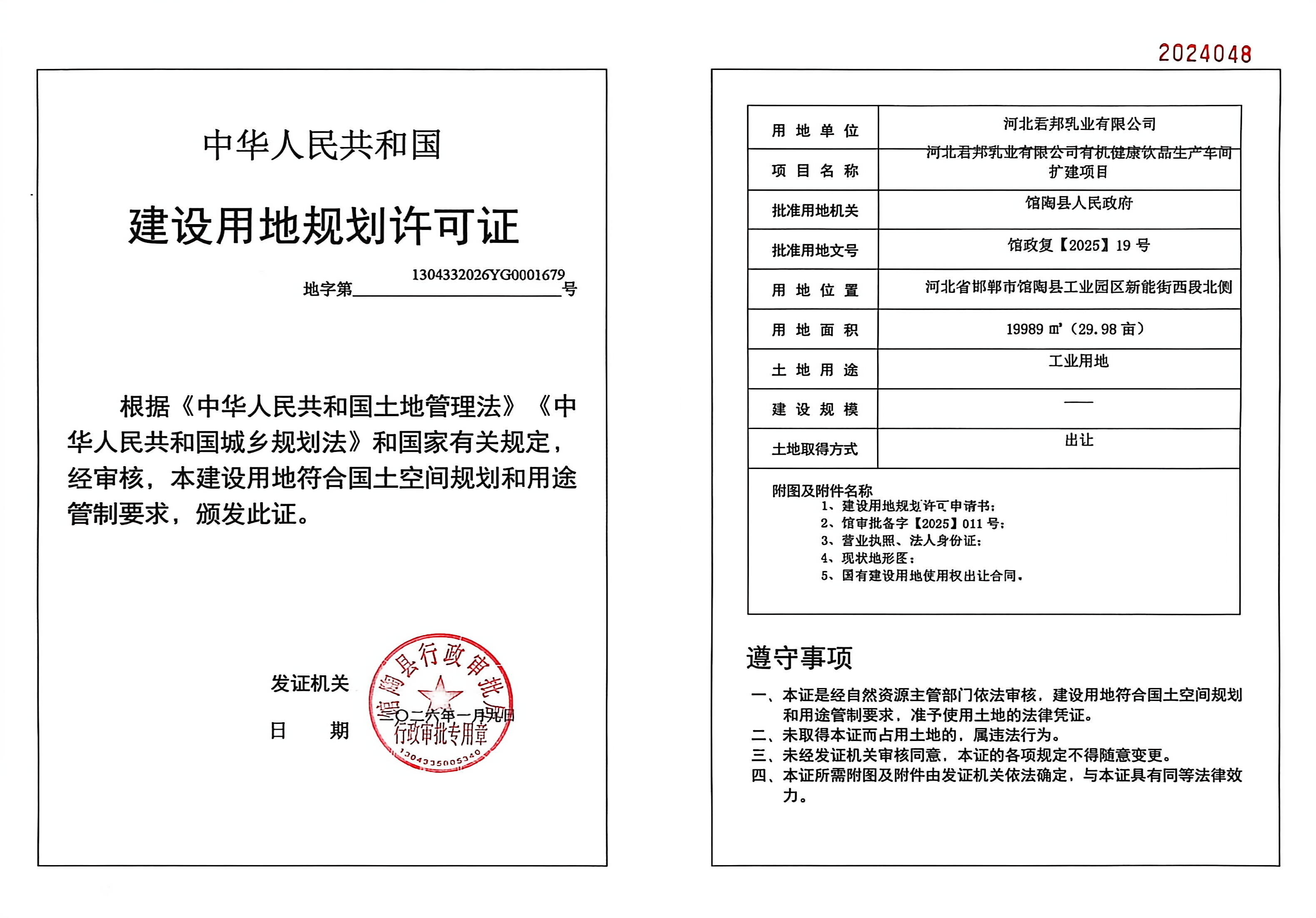 建设单位:河北君邦乳业有限公司;项目名称:河北君邦乳业有限公司有机健康饮品生产车间扩建项目;项目位置:河北省邯郸市馆陶县工业园区新能街西段北侧;发证日期:2026-1-9。