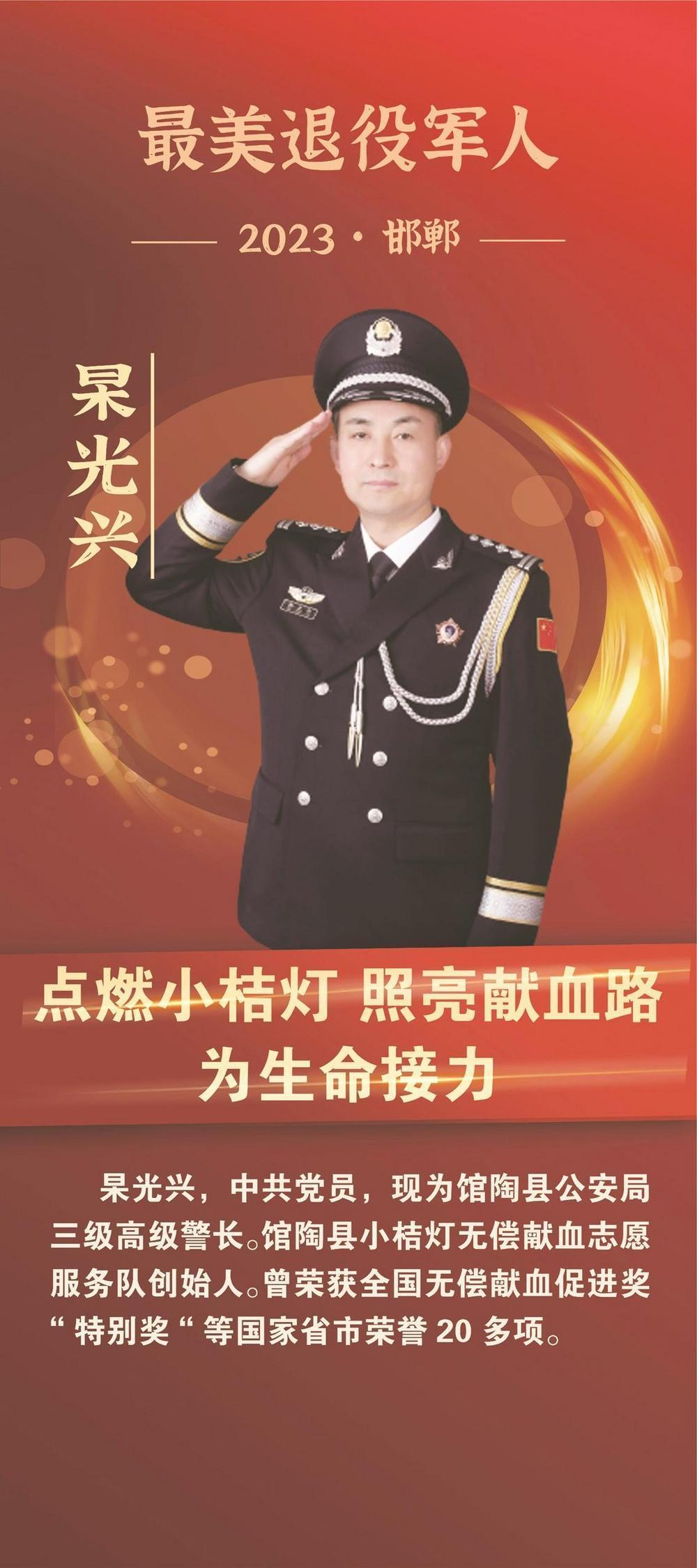 “最美”是一面耀眼的旗帜,凝聚向上的力量。日前,经过严格评选,邯郸市馆陶县杲光兴荣获2023年度“最美退役军人”正式公布。