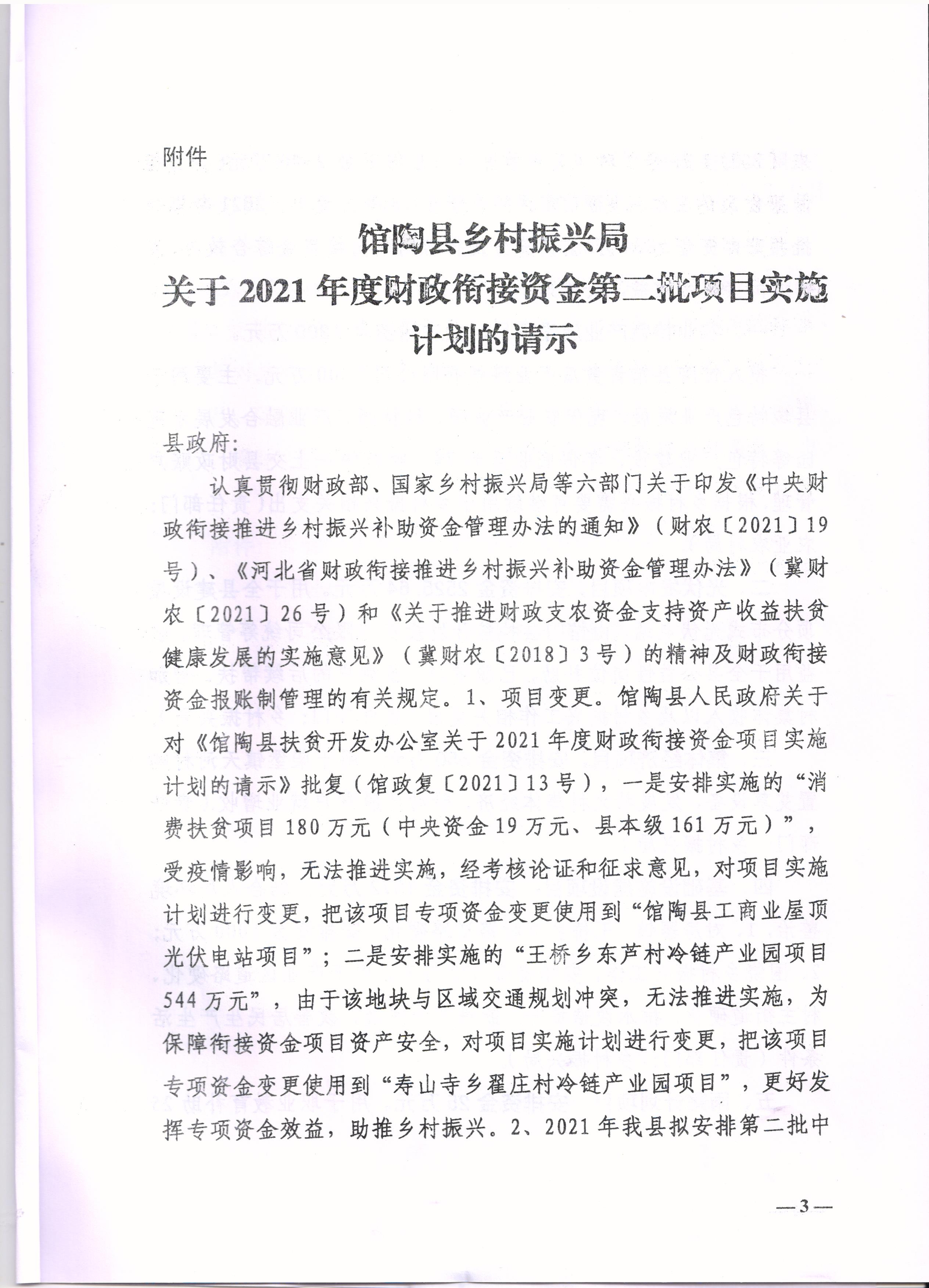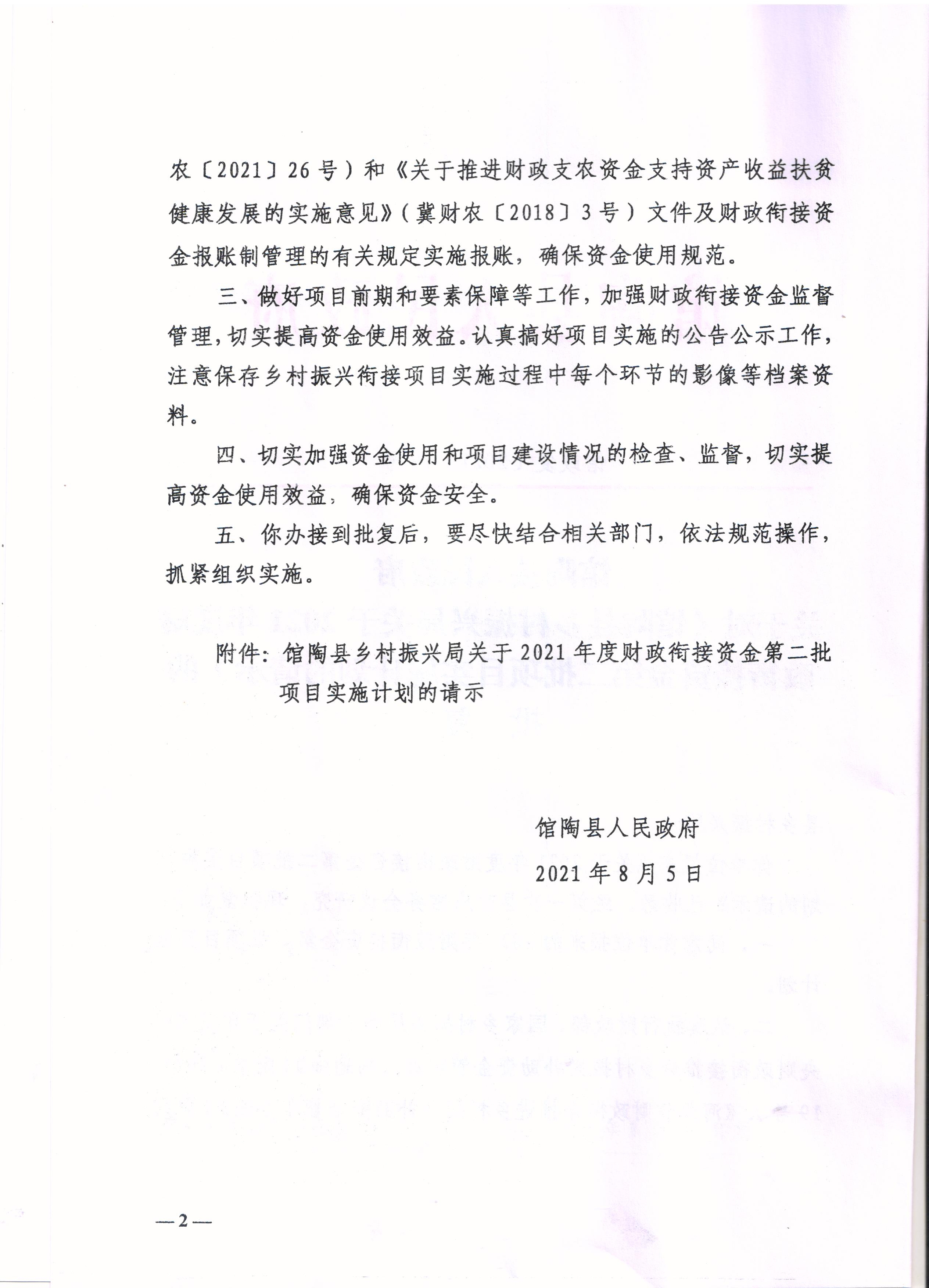 馆陶县人民政府关于对《馆陶县扶贫开发办公室关于2020年度统筹整合涉农财政资金第二批项目实施计划的请示》的批复,详见附件