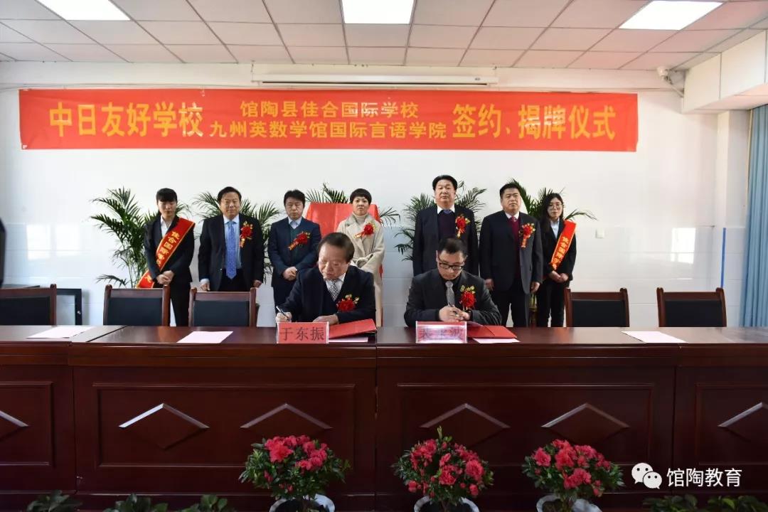 1月17日下午,馆陶县佳合国际学校、日本九州英数学馆国际言语学院“中日友好学校”签约揭牌仪式在佳合国际学校举行。日本九州英数学馆国际言语学校理事、常务副校长于东振,日本九州英数学馆国际言语学校学务主任田中太郎,馆陶县人民政府副县长胡桂芹,县教育体育局党组书记、局长赵树新,副科级干部吴延强,江苏佳合教育集团董事长、佳合国际学校董事长裴永波,佳合国际学校校长裴永模共同出席活动。