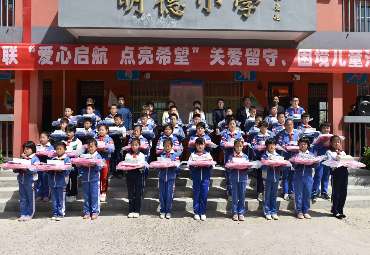 与会领导为留守儿童代表赠送爱心物资。
