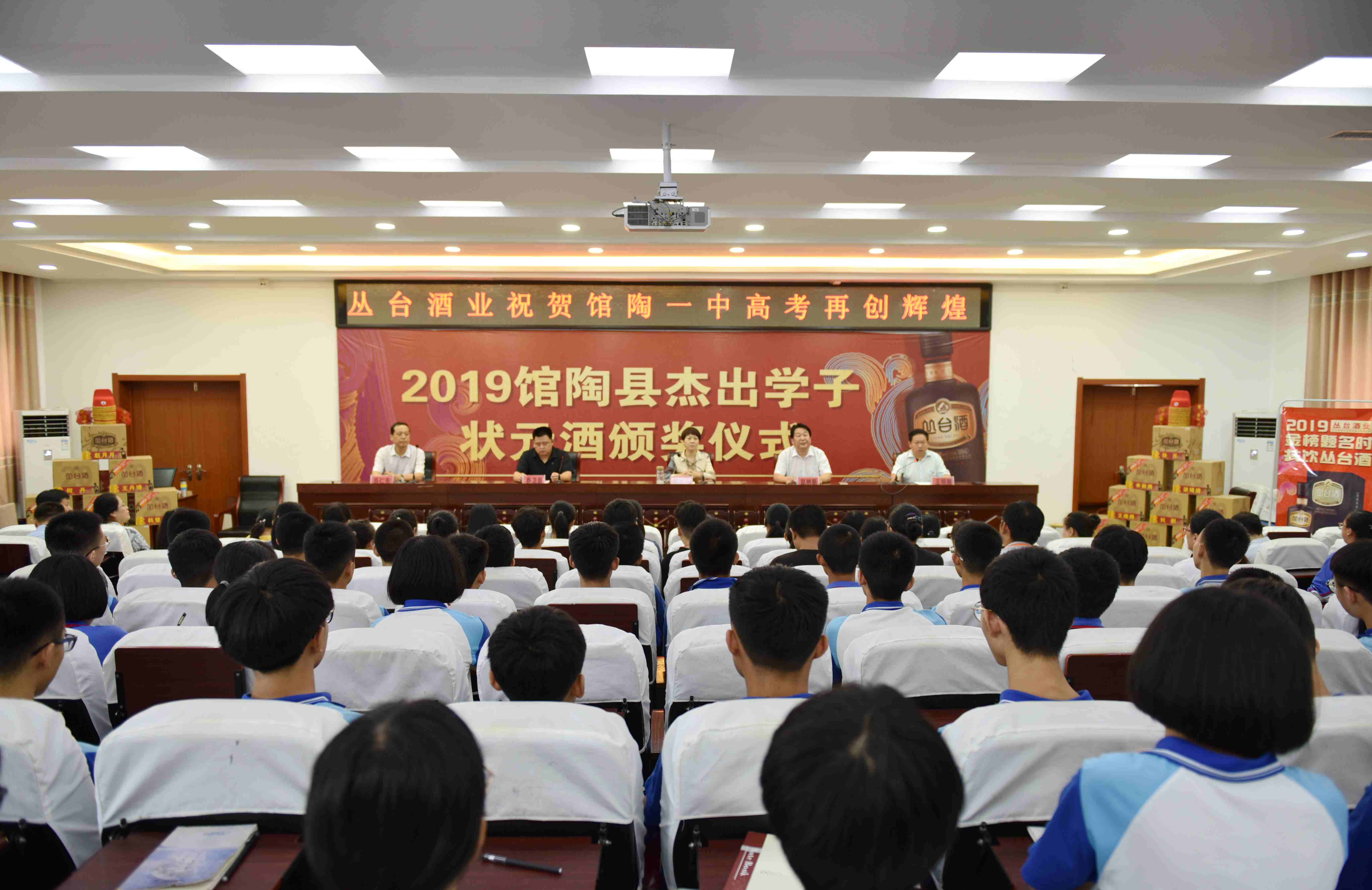 8月10日上午,2019年邯郸丛台酒业奖励馆陶高考杰出学子颁奖仪式在县一中综合楼会议室举行。县政府副县长胡桂芹,县教育体育局党组书记、局长赵树新,邯郸市丛台酒业销售有限公司发展部总监乔卫臣出席仪式,县一中学校领导班子、获奖教师、学生及家长、高三学生代表共计200余人参加了仪式。