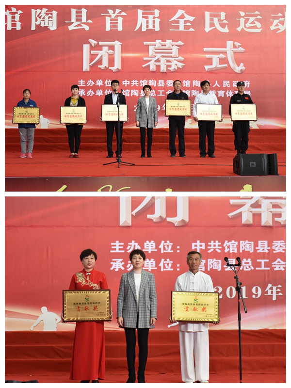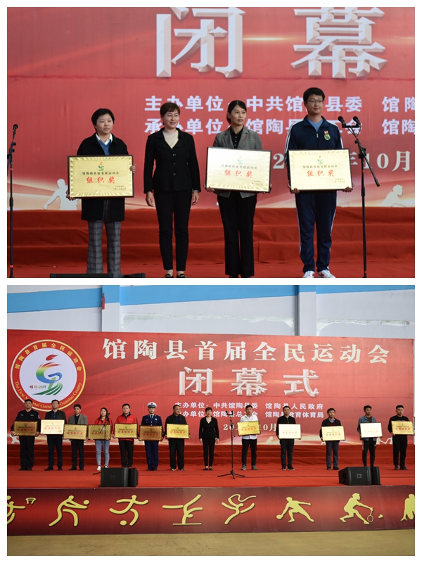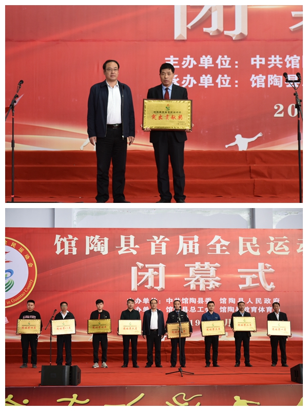 馆陶县首届全民运动会进行了篮球、足球、乒乓球、羽毛球、拔河、健身操、太极拳、毽球、象棋9个比赛项目,历时10天,来自全县的49支队伍,1123人参加了比赛。经过激烈角逐,24个单位分别荣获组织奖、优秀组织奖、贡献奖、体育道德风尚奖和突出贡献奖,评选了优秀运动员25名,优秀裁判员45名。馆陶县首届全民运动会赛出了风格、赛出了水平、赛出了友谊,全面展示了近年来馆陶经济社会发展成果、“两新一比”精神风貌和“不忘初心、牢记使命”主题教育取得的成效,激发了新活力,推动了新发展,是一届精彩、圆满、震撼的体育盛会。